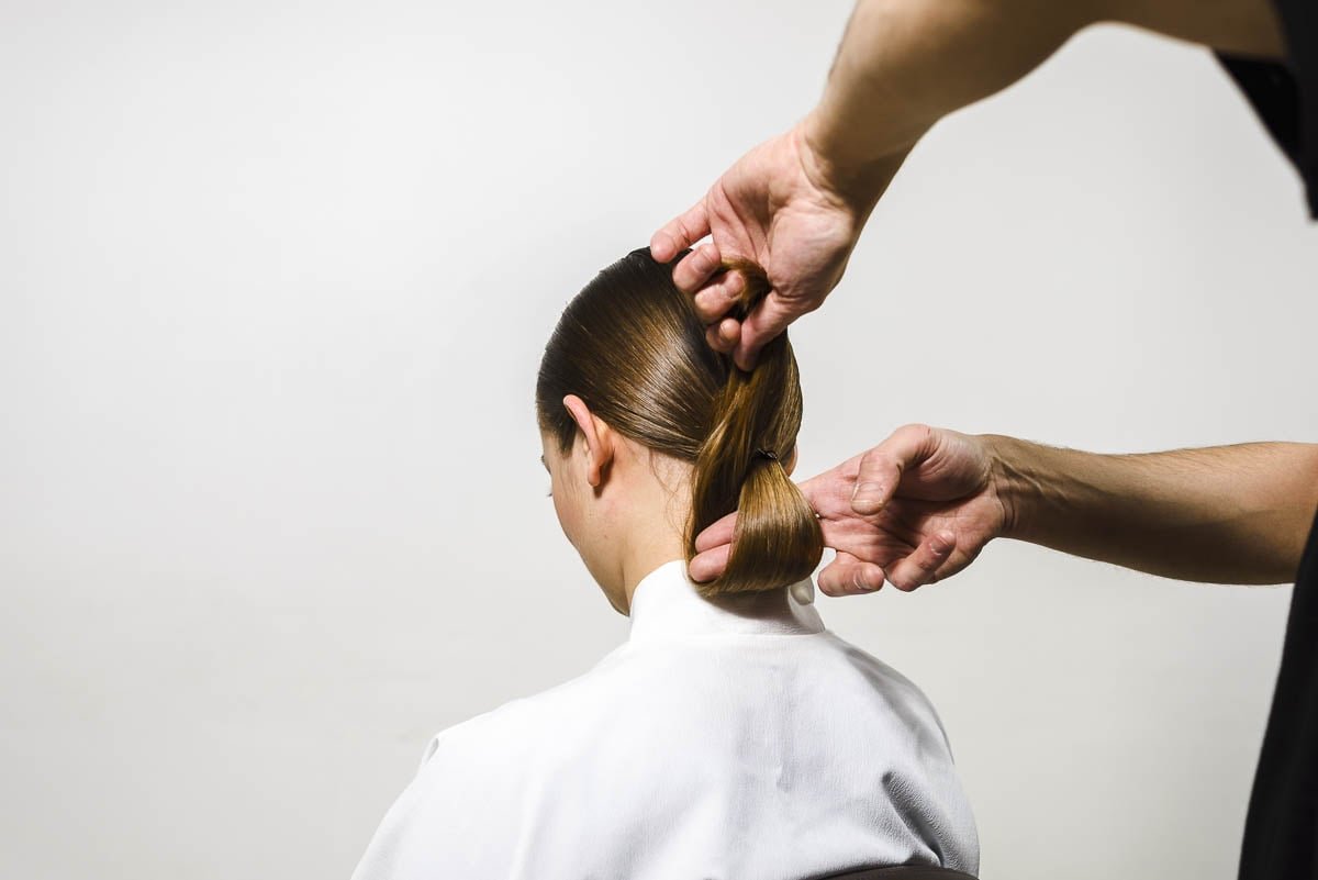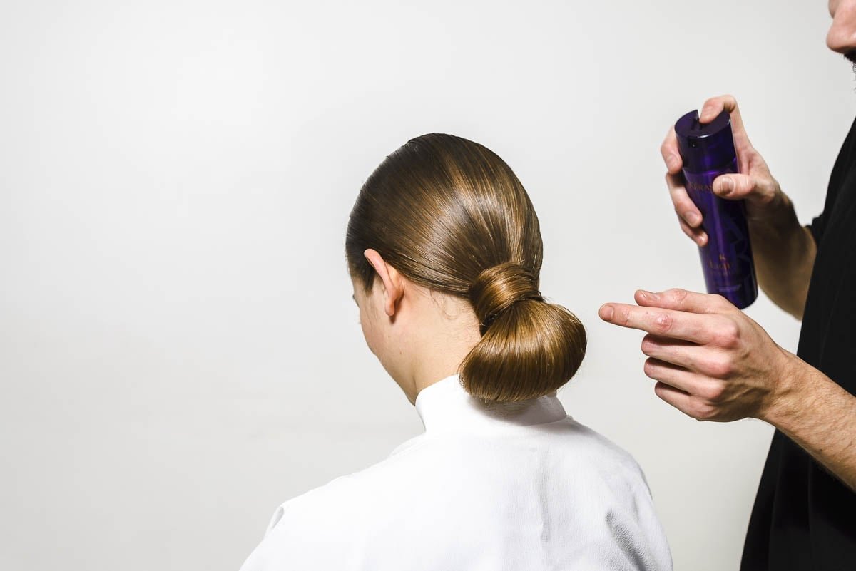 Üst kısımlara Laque Couture uyguladıktan sonra saçları kancalı bir lastik tokayla ense hizasında atkuyruğu yapın.